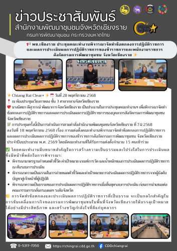 💖 นางนิตยา ดีสุวรรณ์ พัฒนาการจังหวัดเชียงราย เป็นประธานในการประชุมคณะทำงานฯ เพื่อพิจารณาจัดทำข้อตกลงการปฏิบัติราชการและผลการประเมินผลการปฏิบัติราชการของบุคลากรสังกัดกรมการพัฒนาชุมชน จังหวัดเชียงราย